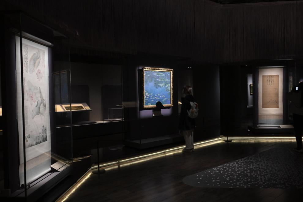 “观花”单元中,明陈洪绶绘《红莲图轴》和清石涛绘《墨荷图轴》并排展示,不禁使人吟上一句“不要人夸颜色好,只留清气满乾坤”。莫奈名作《睡莲》与《睡莲池》惊艳亮相,光影色彩间描绘出画家对大自然的珍爱。